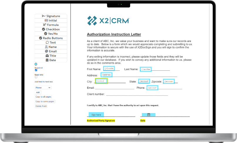 We built X2DocSign for a client with X2Studio, and now it is part of X2CRM! Send a PDF directly from X2CRM for clients to update and sign, and the data automatically syncs back to your database.